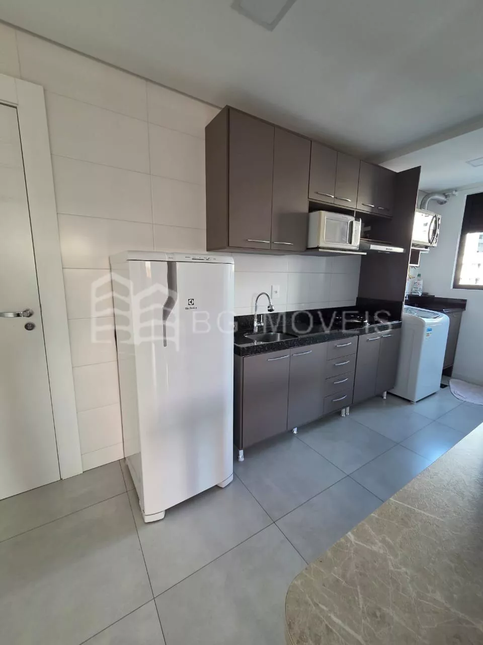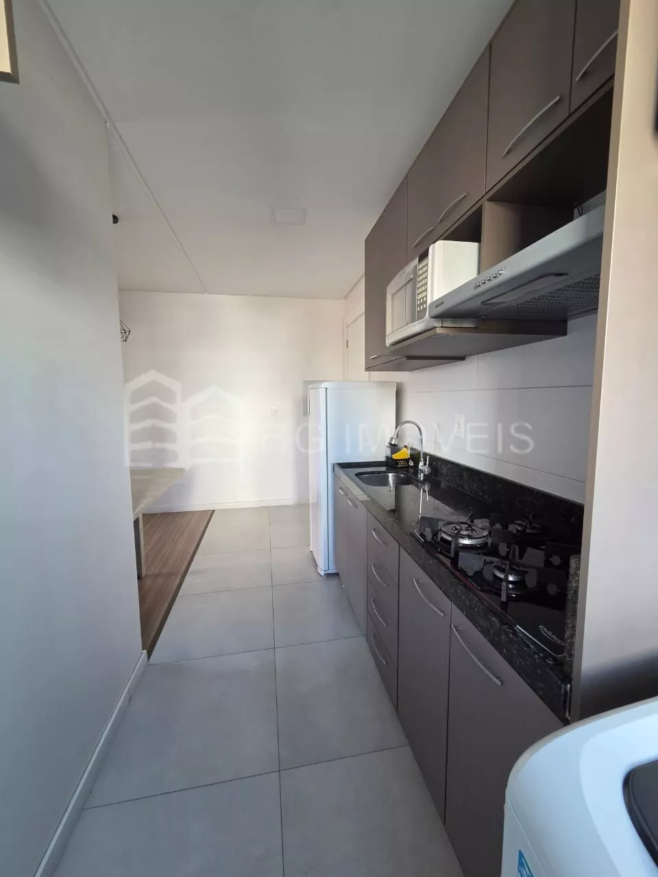 Cozinha completa com armários, cooktop e geladeira;