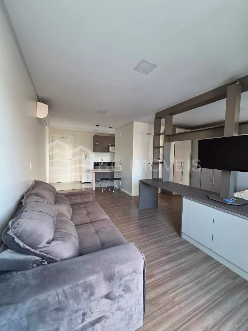Sala com sofá, ar condicionado e TV;