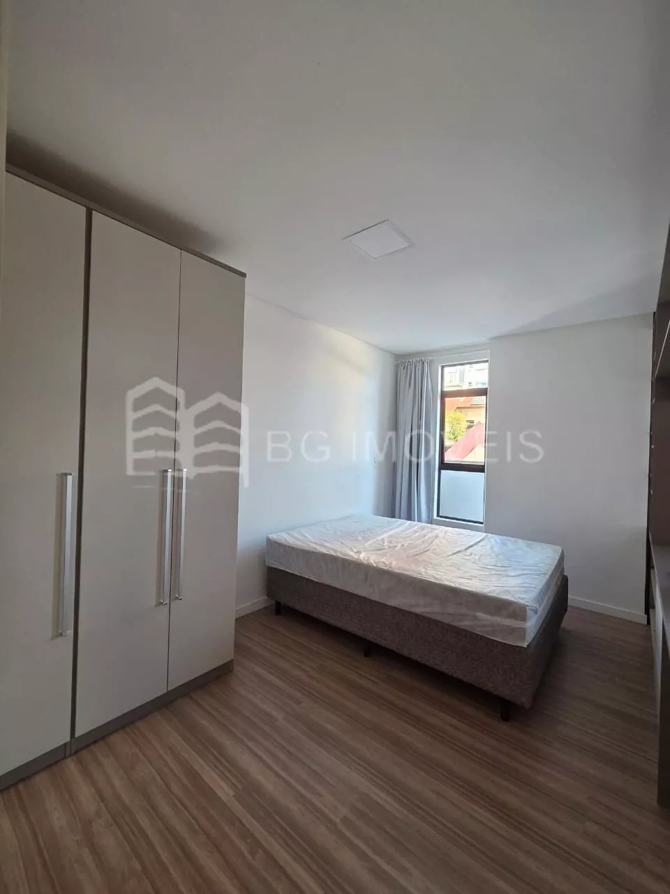 Quarto integrado com roupeiro sob medida e cama de casal;