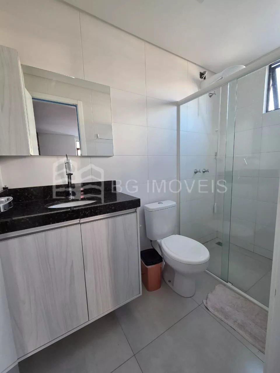 Banheiro com armários, box de vidro e chuveiro elétrico.