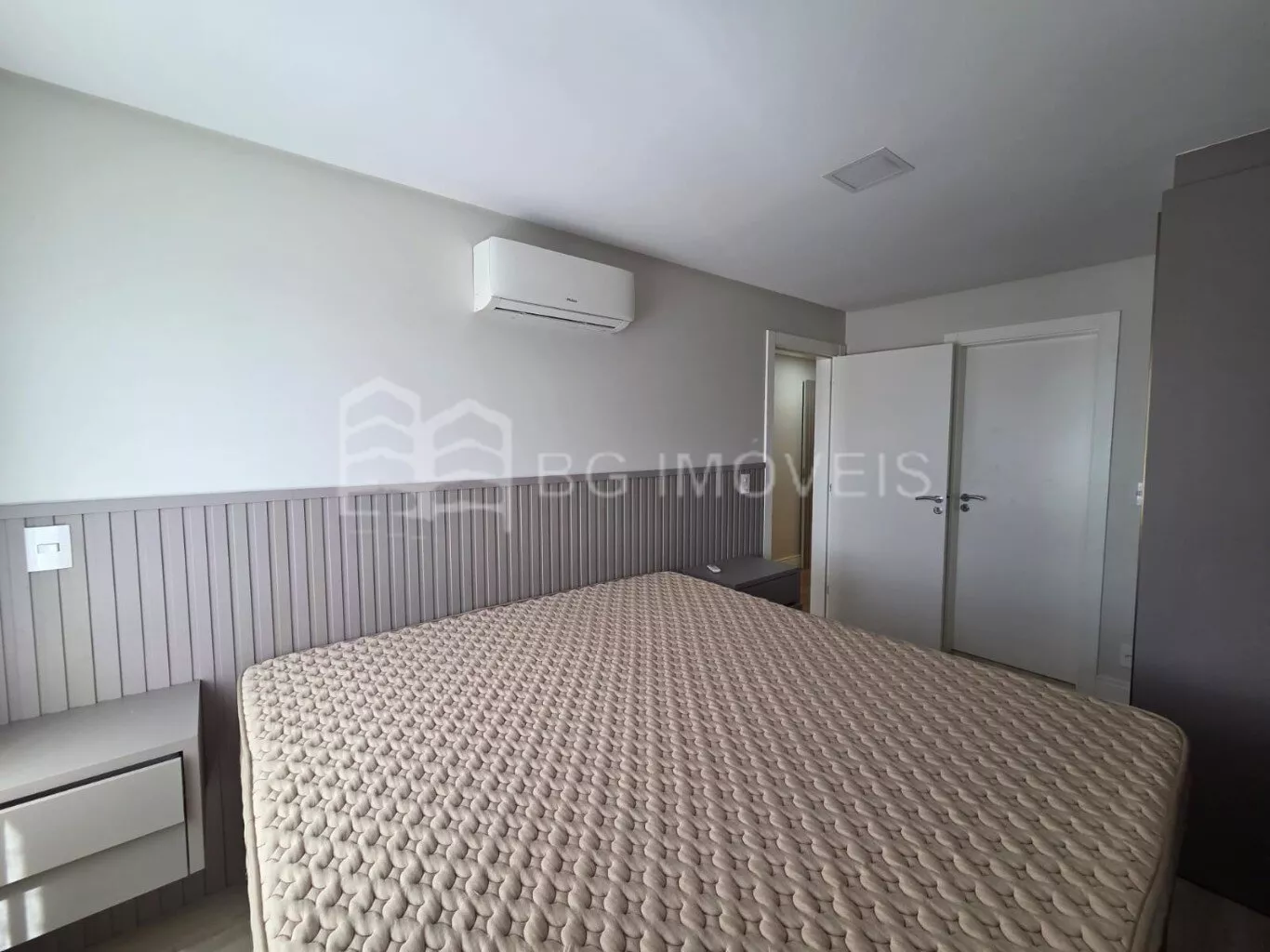 * Suíte com móveis sob medida, cama box King Size com colchão de molas ensacadas, baú para maior espaço de armazenamento, ar-condicionado de 12.000 BTUs, roupeiro e cortina em tecido com blackout;