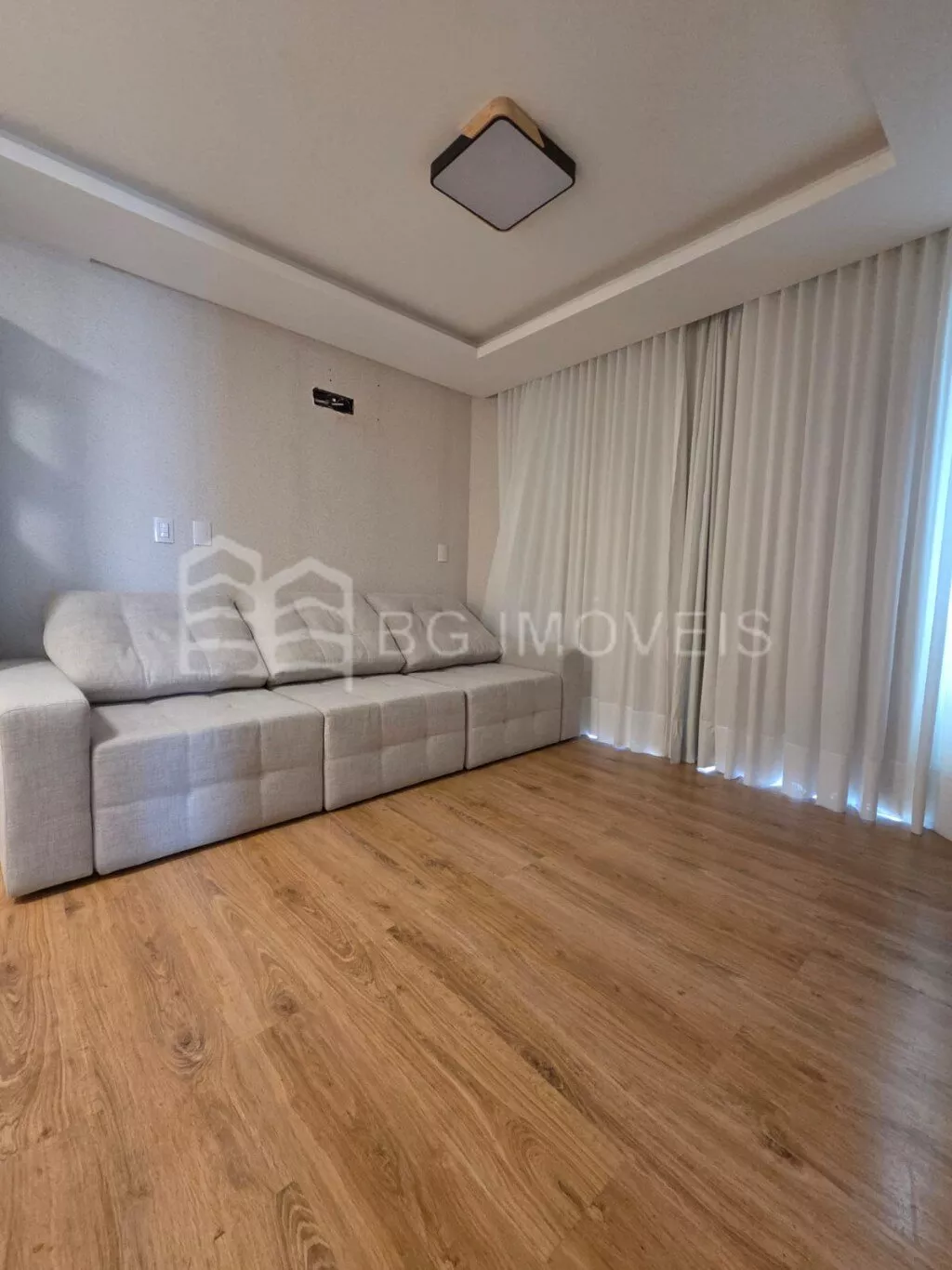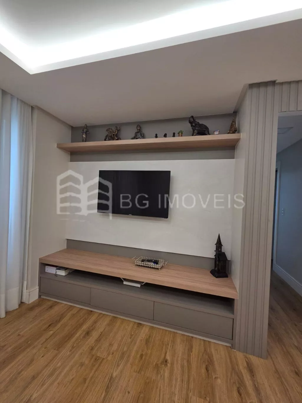 * Sala de estar com painel de TV sob medida, sofá retrátil e reclinável de 3 lugares, cortina em tecido com blackout e TV, proporcionando conforto e comodidade;