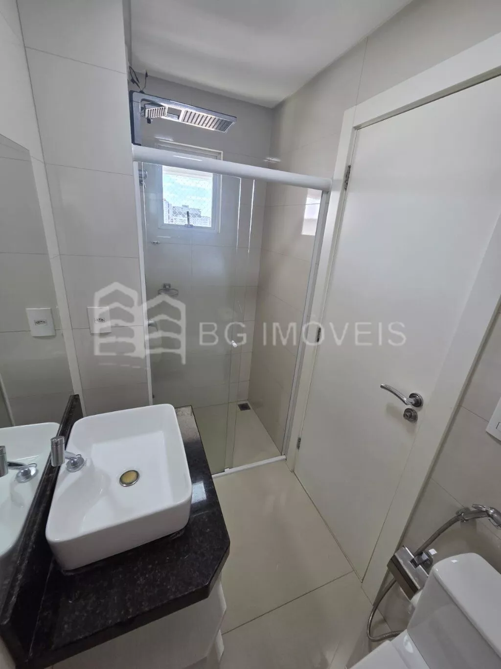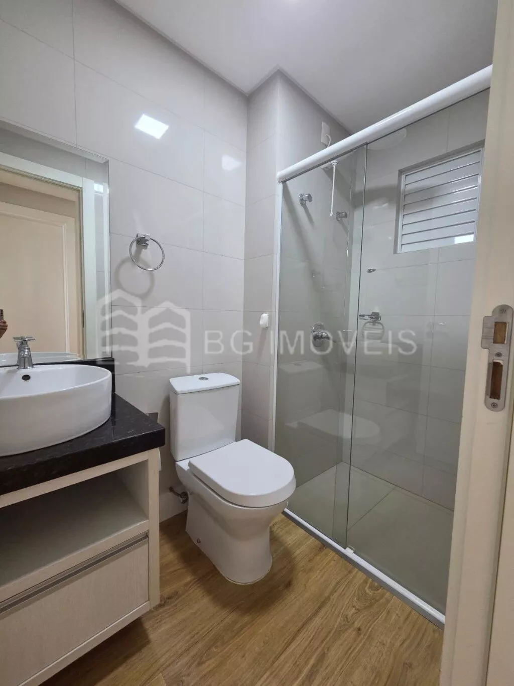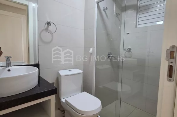 * Banheiro social com pia e armário, box em vidro temperado e chuveiro elétrico Lorenzetti;