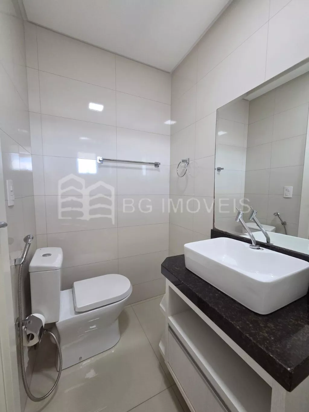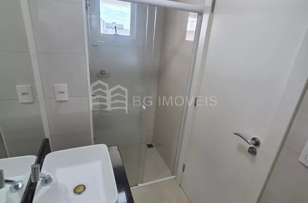 * Banheiro da suíte com pia e armário, box em vidro temperado e chuveiro elétrico Lorenzetti Acqua Ultra;