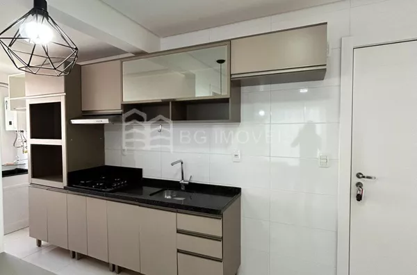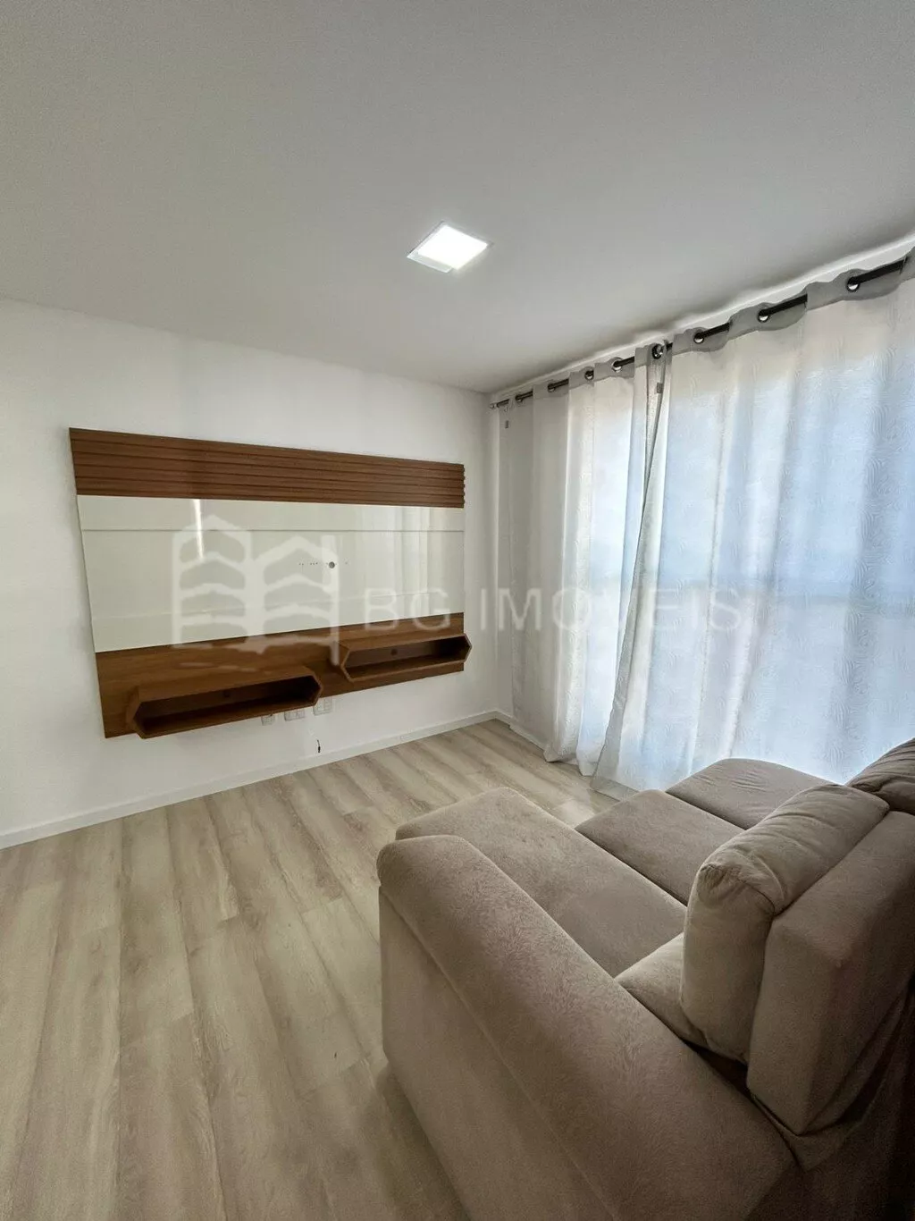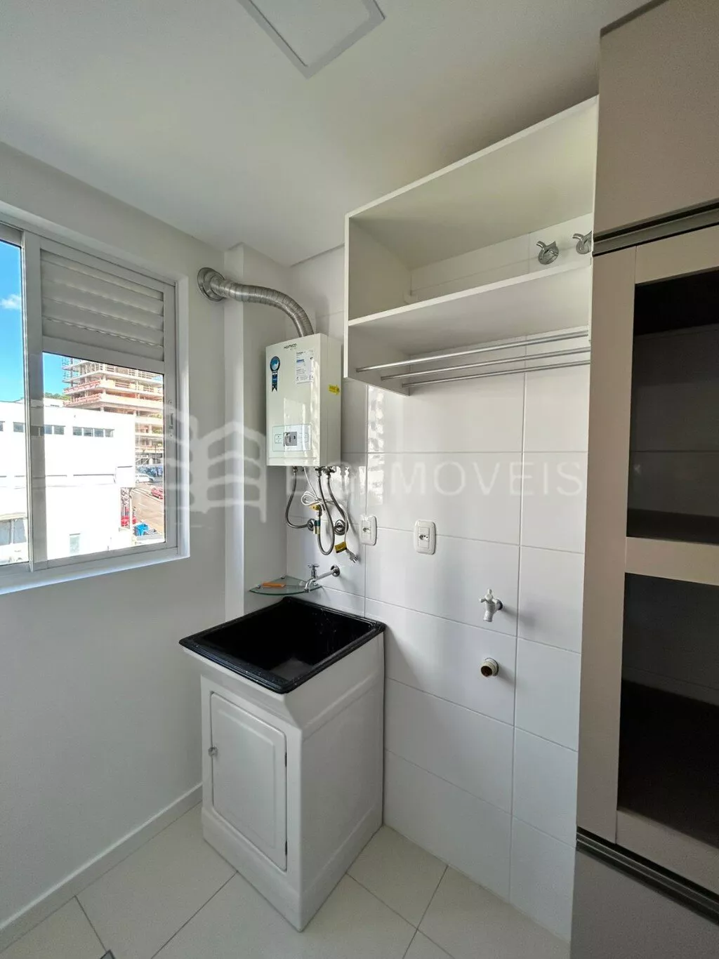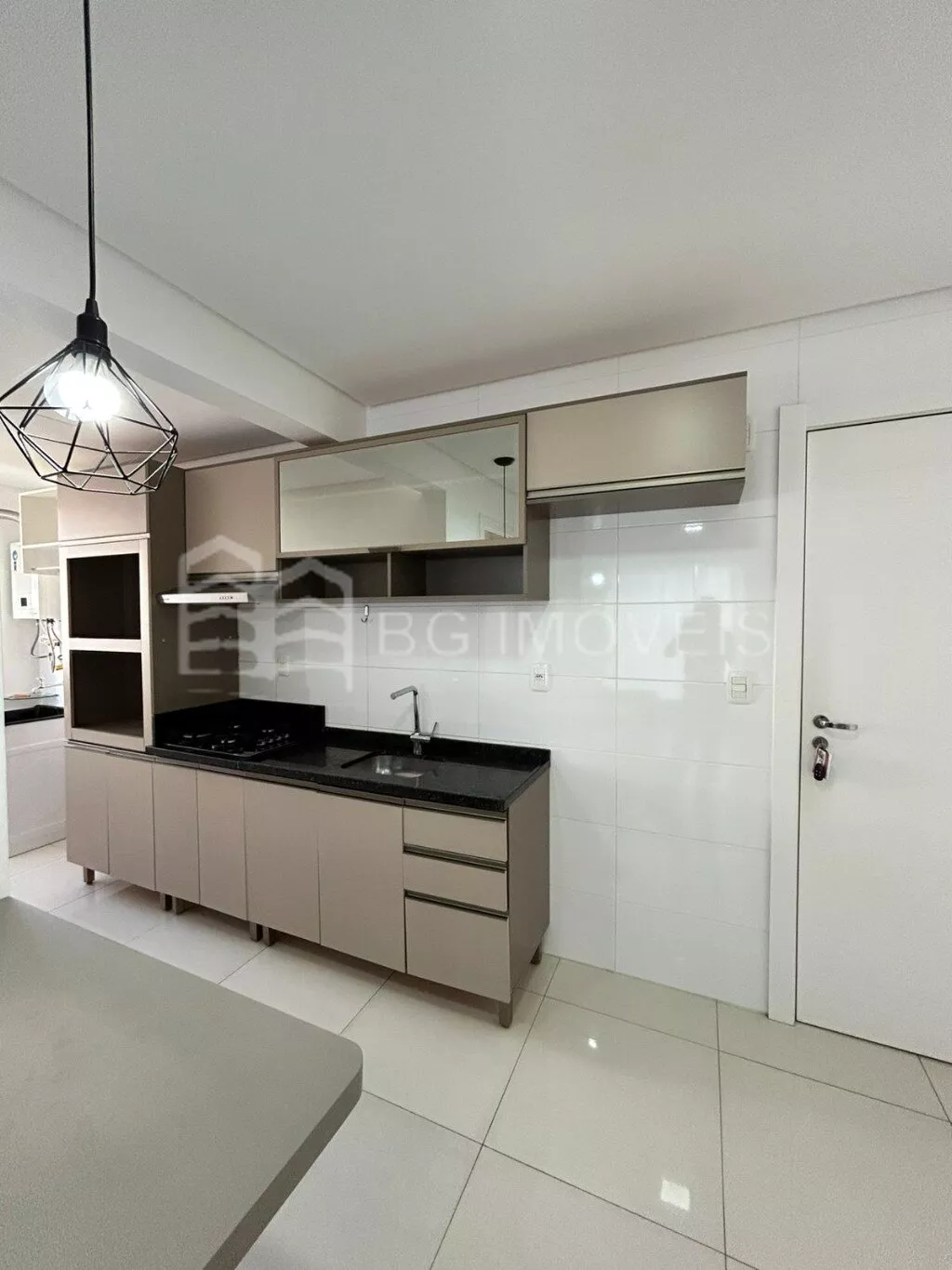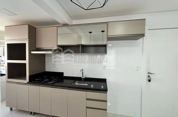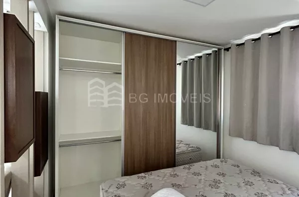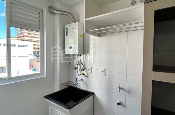 1 quarto com cabeceira e roupeiroSala com painel de TVCozinha com pia, fogãoLavanderia com piaGaragem
