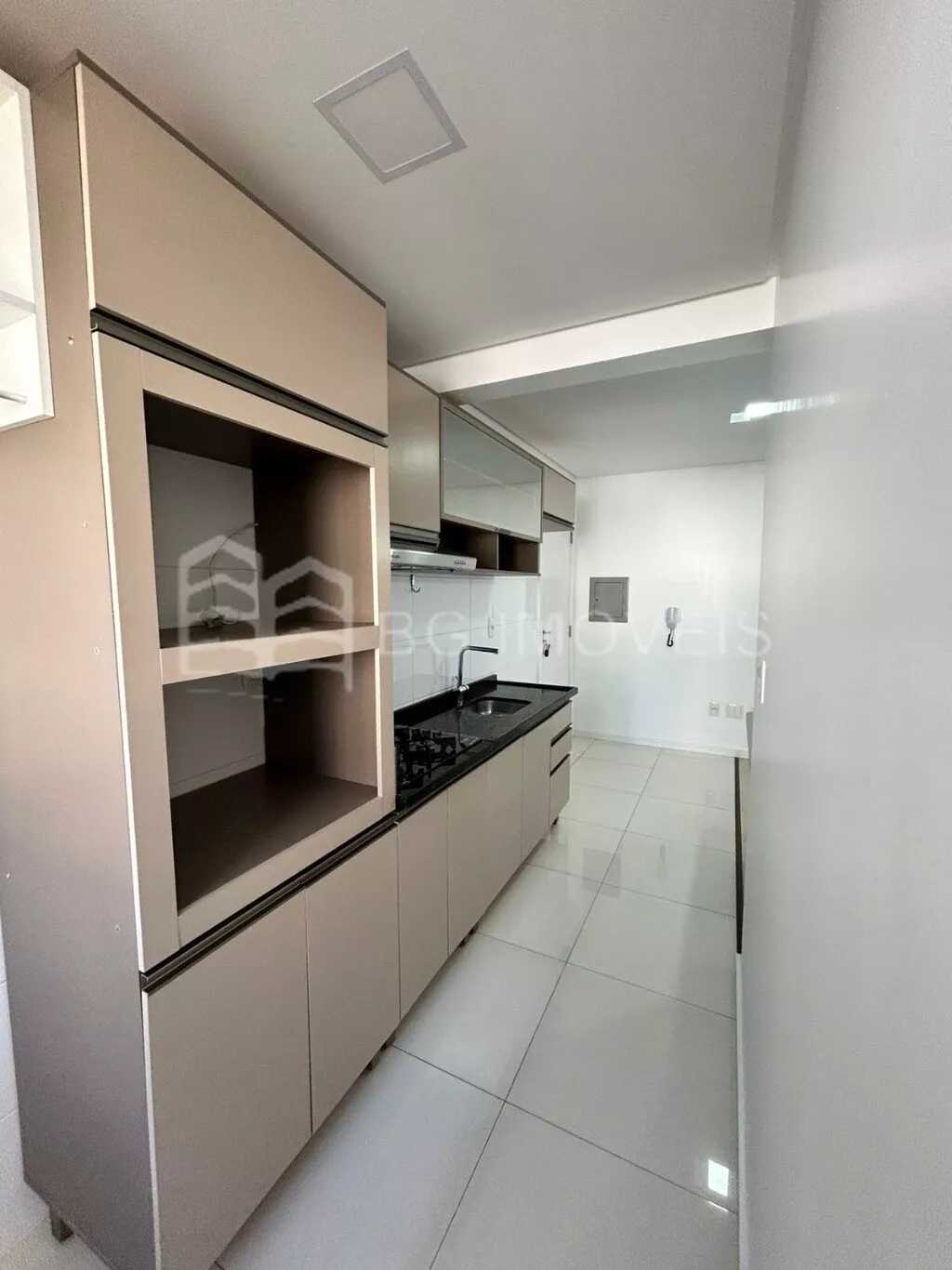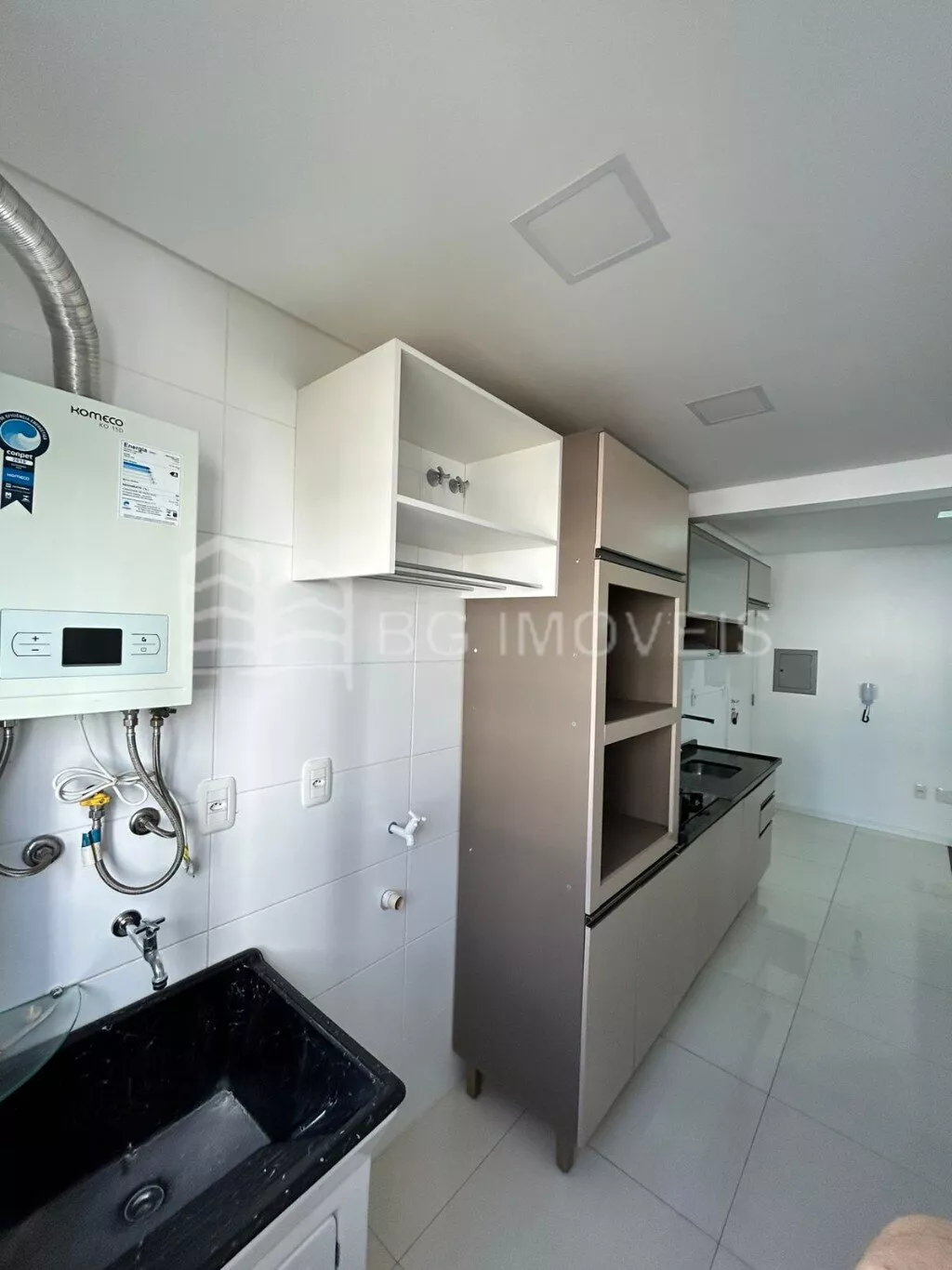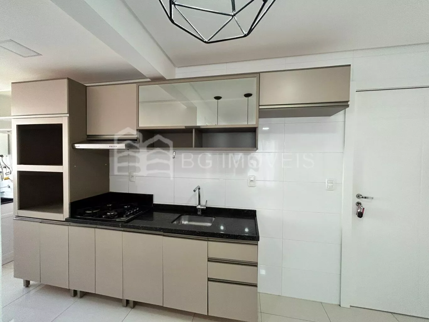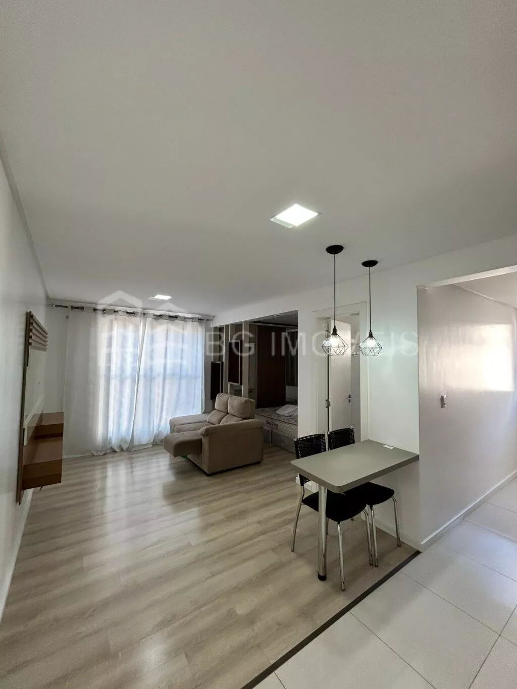 1 quarto com cabeceira e roupeiroSala com painel de TVCozinha com pia, fogãoLavanderia com piaGaragem