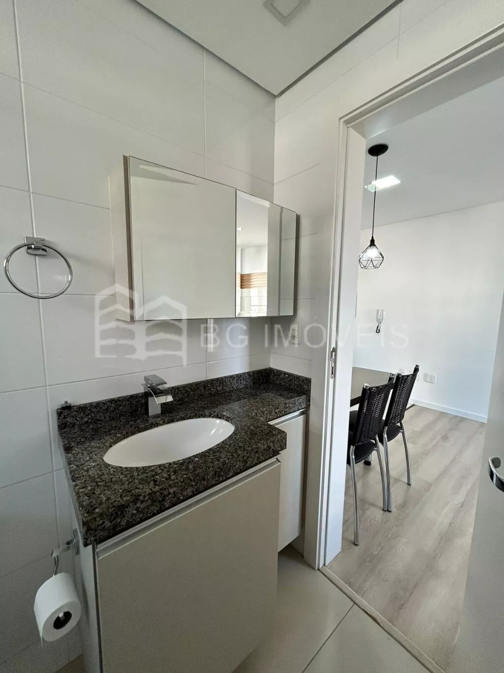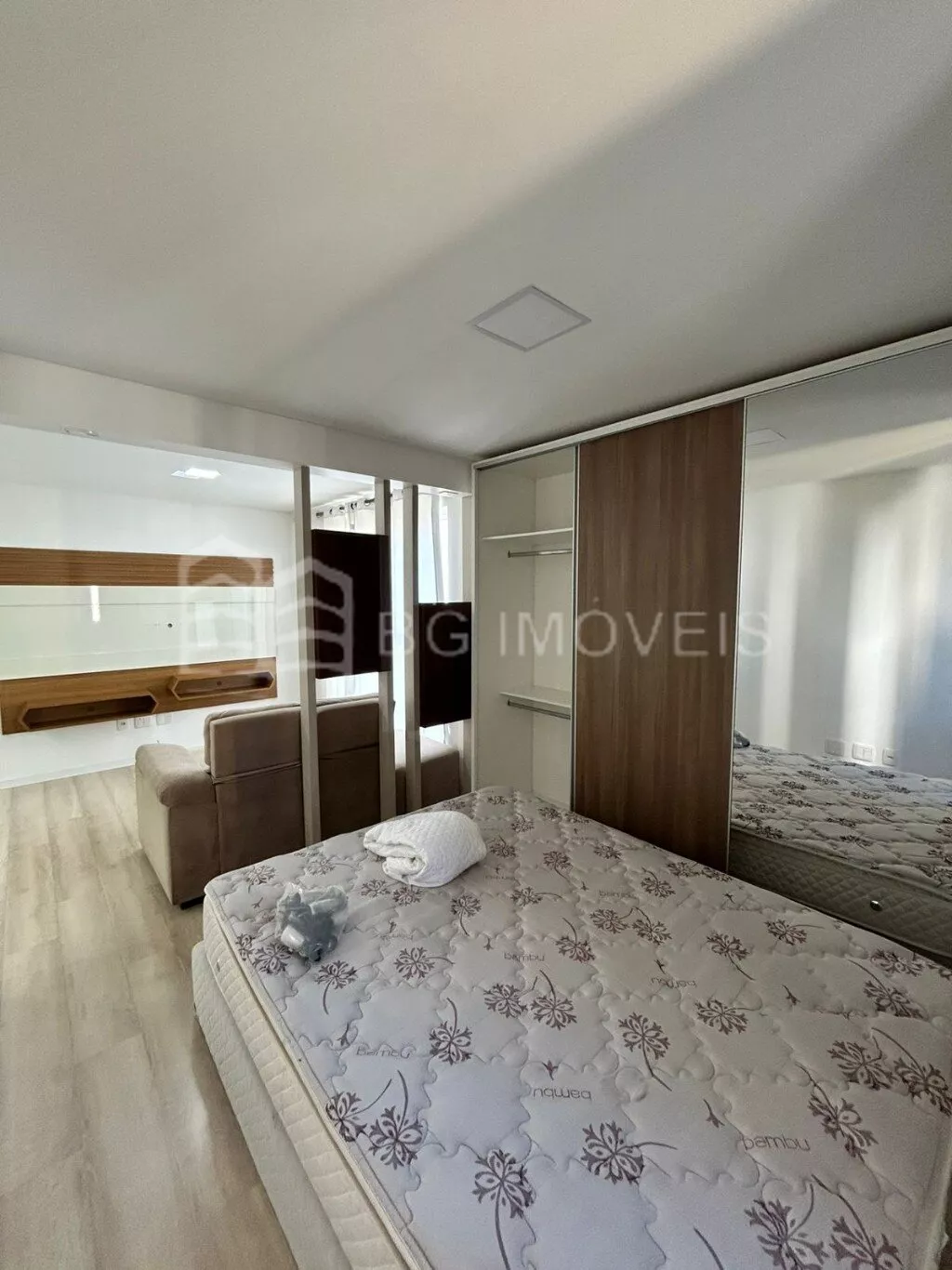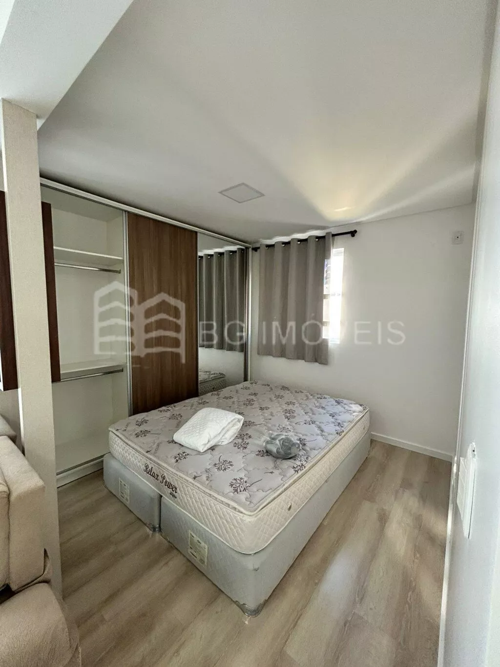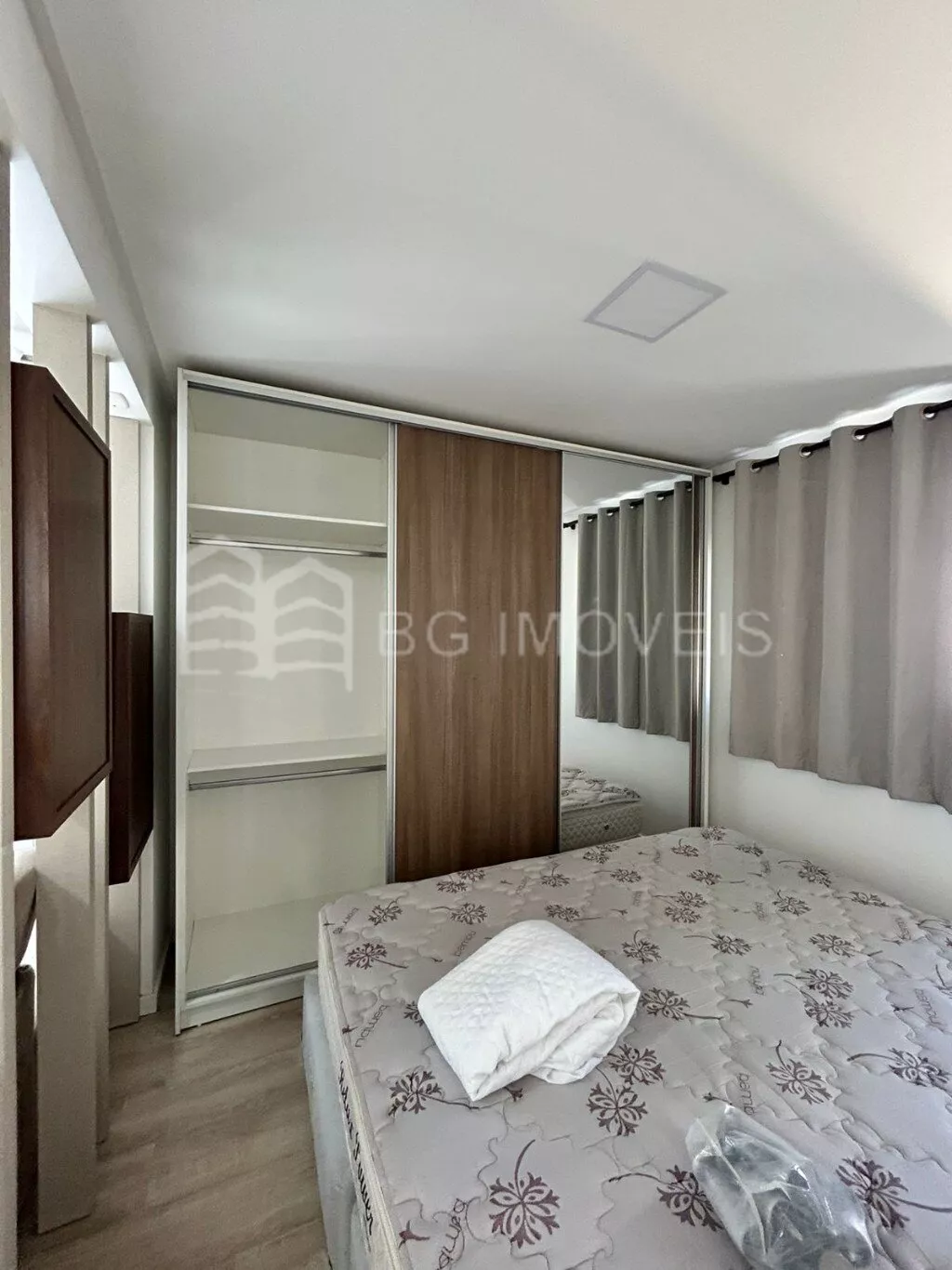 1 quarto com cabeceira e roupeiroSala com painel de TVCozinha com pia, fogãoLavanderia com piaGaragem