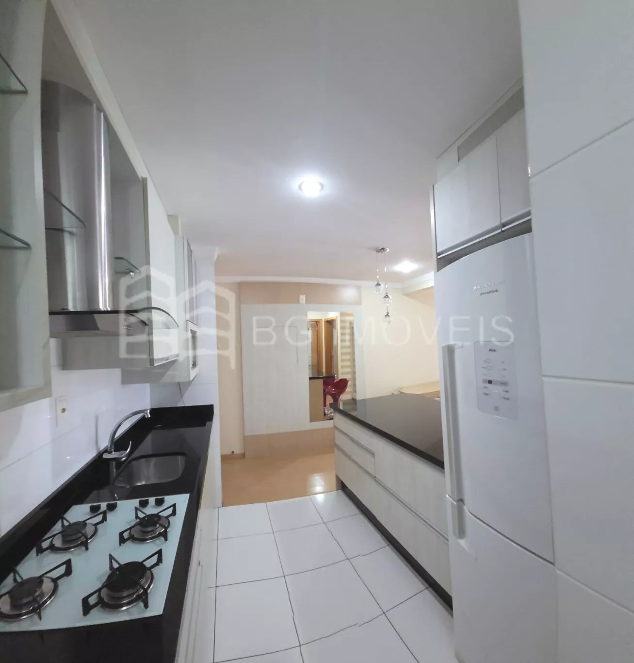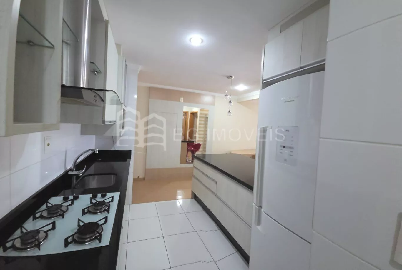 Cozinha completa com armarios sob medida, Cooktop de 4 bocas, Depurador de ar, Geladeira Brastemp Fros Free, microondas, sistema de Água quente à gás;