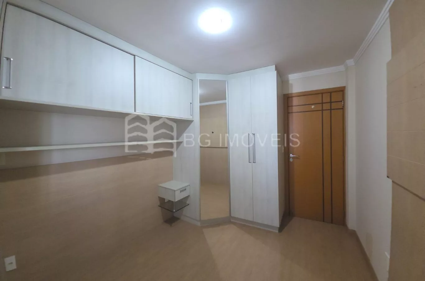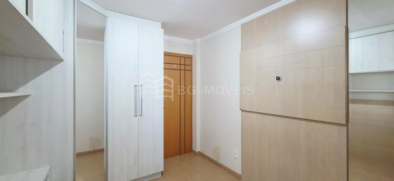 Quarto com roupeiro sob medida e painel de TV;