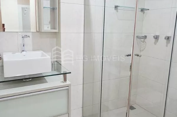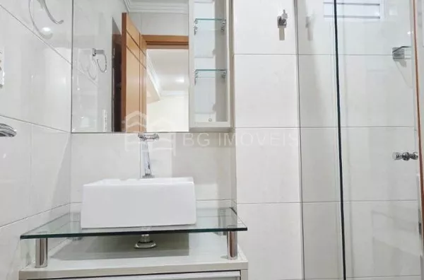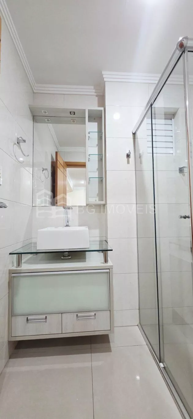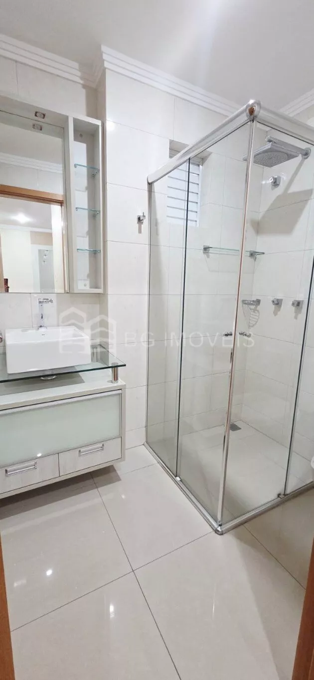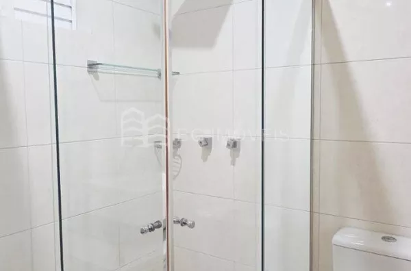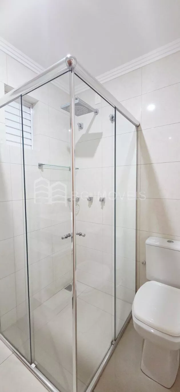 Banheiro social com box de vidro, armario e chuveiro à gás;