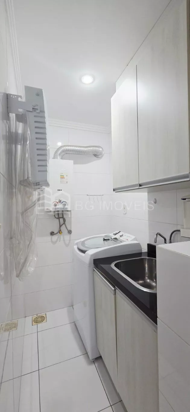 Lavanderia com máquina de lavar 9kg, secadora de roupa de parede, filtro de água e tanque com armários;