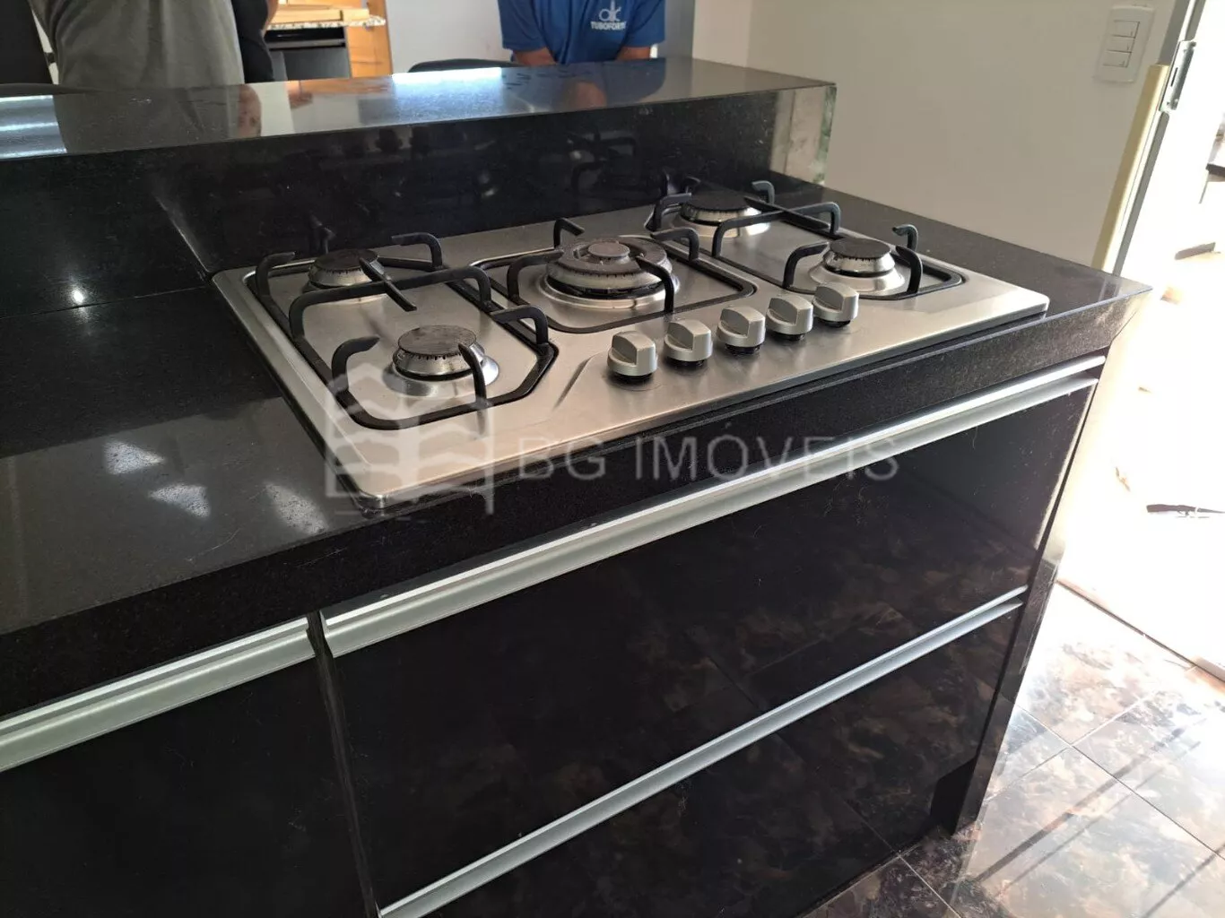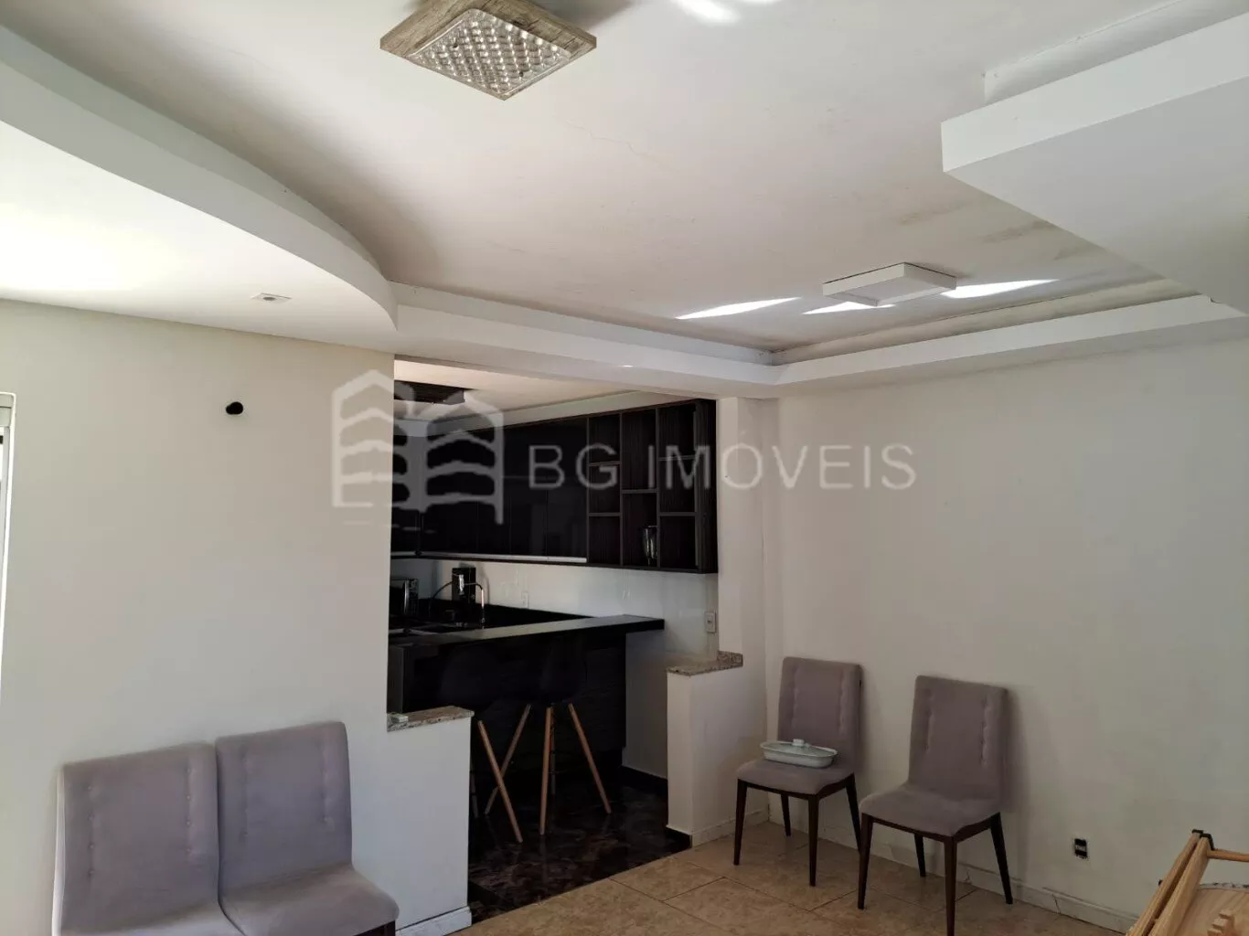 *Cozinha com armários sob medida, geladeira, fogão, forno micro-ondas, filtro de água, banquetas, cadeiras.